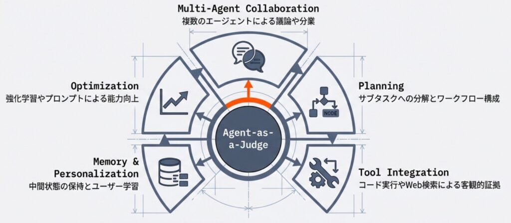 このように、Agent-as-a-Judgeは単なる「評価の自動化」に留まらず、状況を認識して自律的に判断を下す、より高度な知的システムへと進化を続けています。