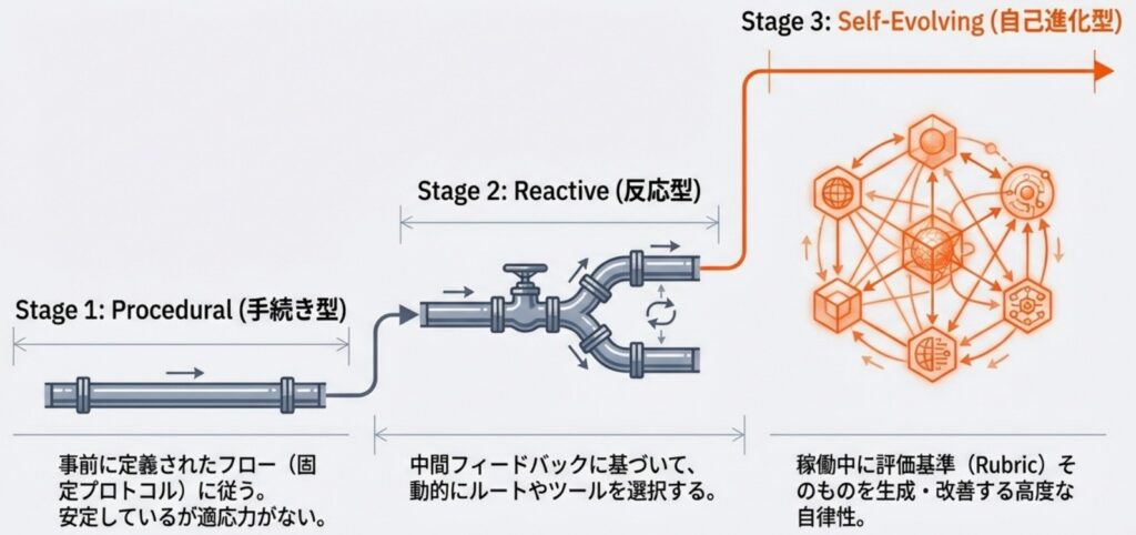エージェント型評価システムへの移行は、単一のモデルによる推論から、分散化された意思決定と実行ベースの検証へとアーキテクチャが根本から変化することを意味します。この進化の過程は自律性と適応性のレベルに応じて、様々な手法を以下の3段階の発展途上モデルとして整理できます。