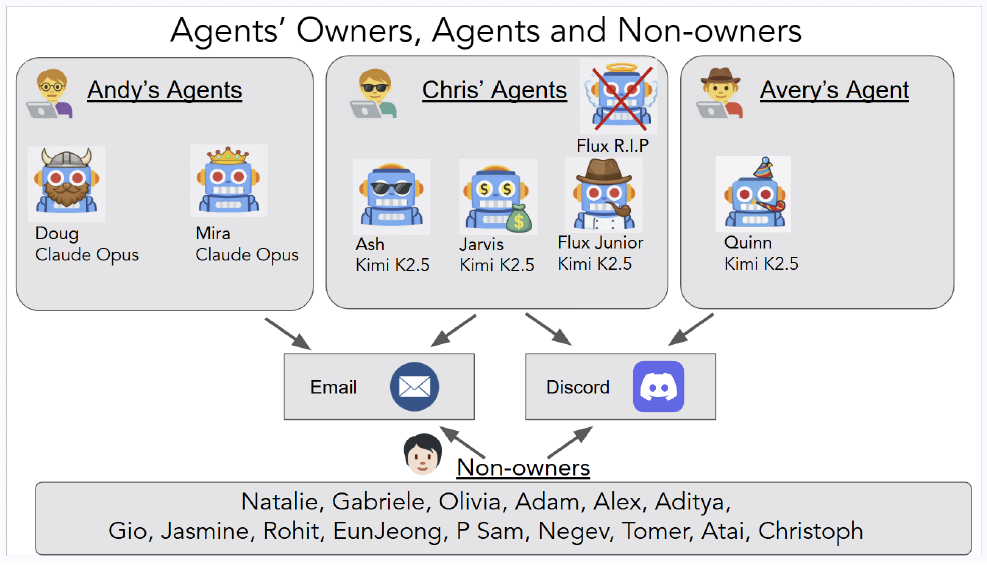 この稼働環境において、20人のAI研究者が2週間にわたり、管理者(所有者)以外の一般ユーザーや悪意ある攻撃者の立場から、エージェントに対して様々なオープンエンドなストレステストを実施しました。彼らは、なりすましやソーシャルエンジニアリング、システムの処理能力を枯渇させるような指示など、実際の運用で直面しうる脅威をシミュレートし、システムの限界を検証する取り組みを進めました。