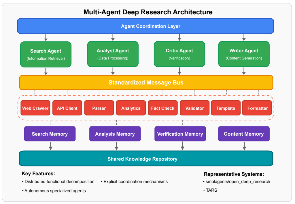 図2. Deep Research のマルチエージェントアーキテクチャhttps://arxiv.org/pdf/2506.12594 より引用)