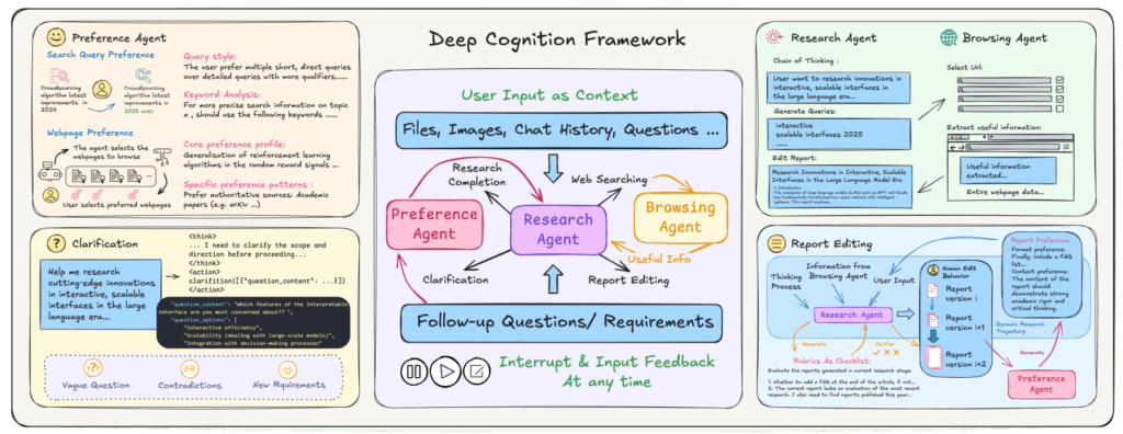 • Deep Cognition: このシステムは、人間とAIのインタラクション自体をインテリジェンスの根本的な次元として再概念化し、Deep Researchタスクにおける「認知オーバーサイト」パラダイムを提唱しています。AIの推論を可視化し、任意の時点での介入を可能にする透明で制御可能かつ中断可能なインタラクション、きめ細かい双方向対話、そしてシステムがユーザーの行動を観察・適応する共有された認知的コンテキストという3つの主要なイノベーションを実装しています。ユーザー評価では、透明性、きめ細かいインタラクション、リアルタイム介入などの指標でベースラインを大幅に上回る性能を示しました。