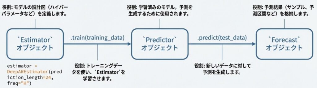 GluonTSにおけるモデルの抽象化は、学習と推論を明確に分離する設計になっています。これを担うのが Estimator と Predictor です。
