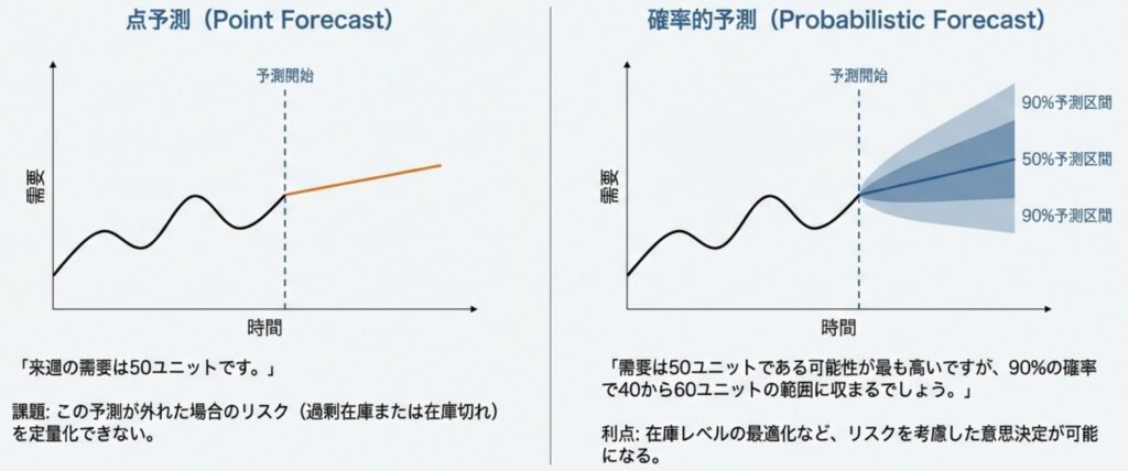従来の多くの機械学習モデルが行う予測は、未来の特定の時点に対して「単一の値」を返す「点予測(Point Forecast)」が一般的です。しかし、GluonTSが採用するアプローチはこれとは異なります。GluonTSは、将来の値が取り得る「確率分布」を予測します。これは、単に「来月の売上は100万円」と予測するのではなく、「売上が90万円から110万円の間に収まる確率は80%である」といった形で、未来を幅を持って捉えることを意味します。