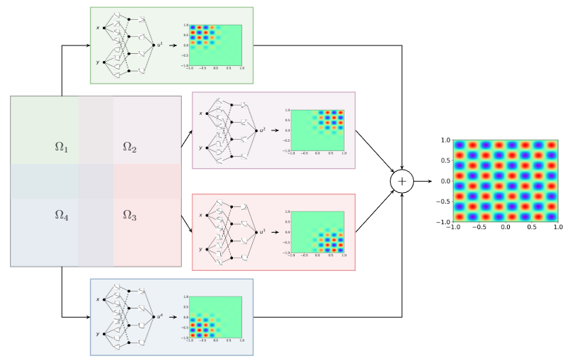 - ドメイン分割 (FBKAN): 複雑な問題領域を、重複する複数の部分領域(サブドメイン)に分割し、それぞれに軽量なローカルKANを割り当てるアプローチです。各ローカルKANの出力は、単一性の分割(Partition of Unity, PoU) と呼ばれる滑らかな関数で重み付けされて結合されます。これにより、大規模な問題の並列学習が可能になり、学習の安定性も向上します。