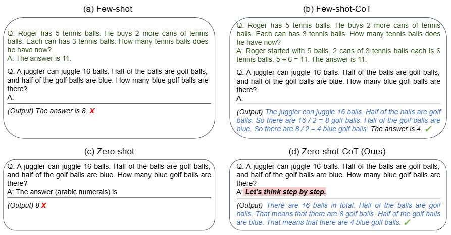 この創発の具体的な証拠の一つが、「Zero-shot Chain-of-Thought (Zero-shot-CoT)」と呼ばれる現象です。