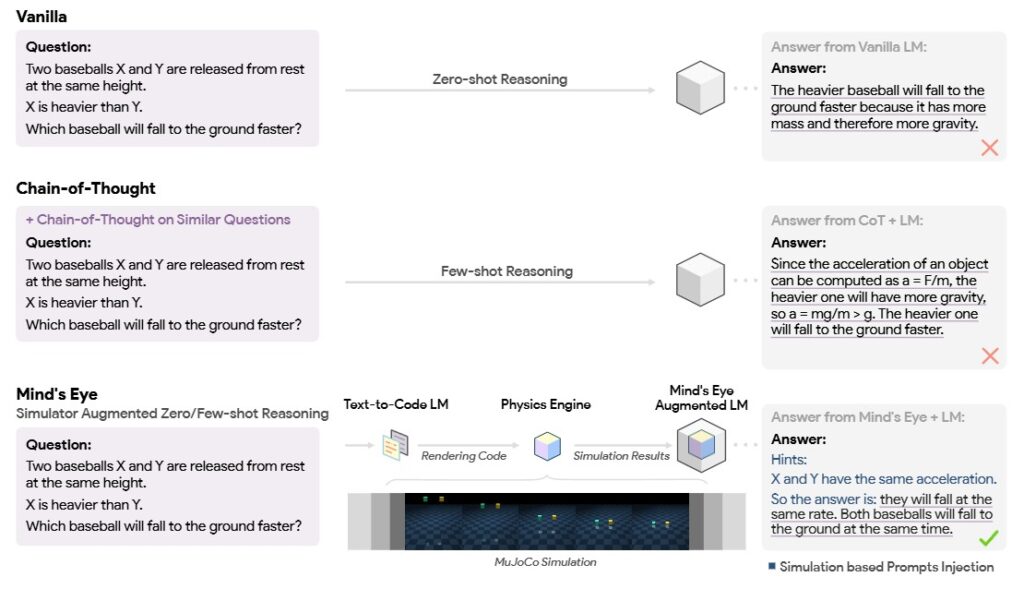 さらに高度な応用例として、Google ResearchによるMind’s Eyeフレームワークがあります。複雑な物流シミュレーションなど、物理的な因果推論が必要なタスクに対し、LLMが推論エンジンとして働き、自ら外部の物理エンジンを呼び出し、そのシミュレーション結果を文脈情報として取り込んで回答を生成するという実装が可能になっています。