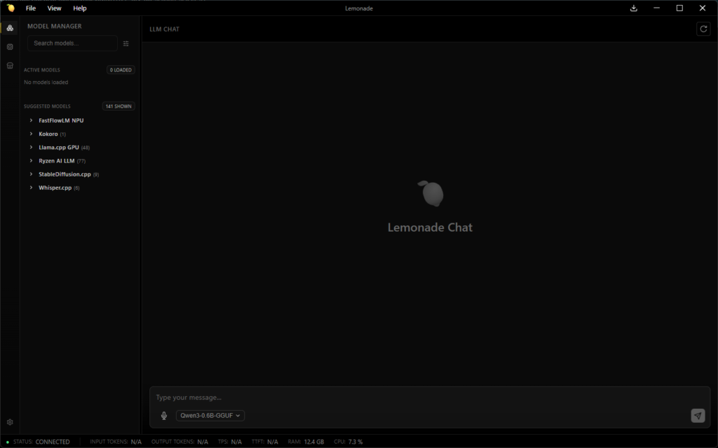 - 手軽な導入と管理: これまでのローカルAI環境構築は、複雑なコマンド操作や設定を進める必要がありました。しかしながら、LemonadeにはWindows、Linux、macOS(ベータ版)向けのインストーラーが用意されており、通常のアプリと同じように数分で導入できます。また、「Model Manager」という付属の管理画面から、チャット用のLLM(大規模言語モデル)や、画像生成、音声認識など様々なAIモデルを検索し、簡単にダウンロードして利用を開始できます。