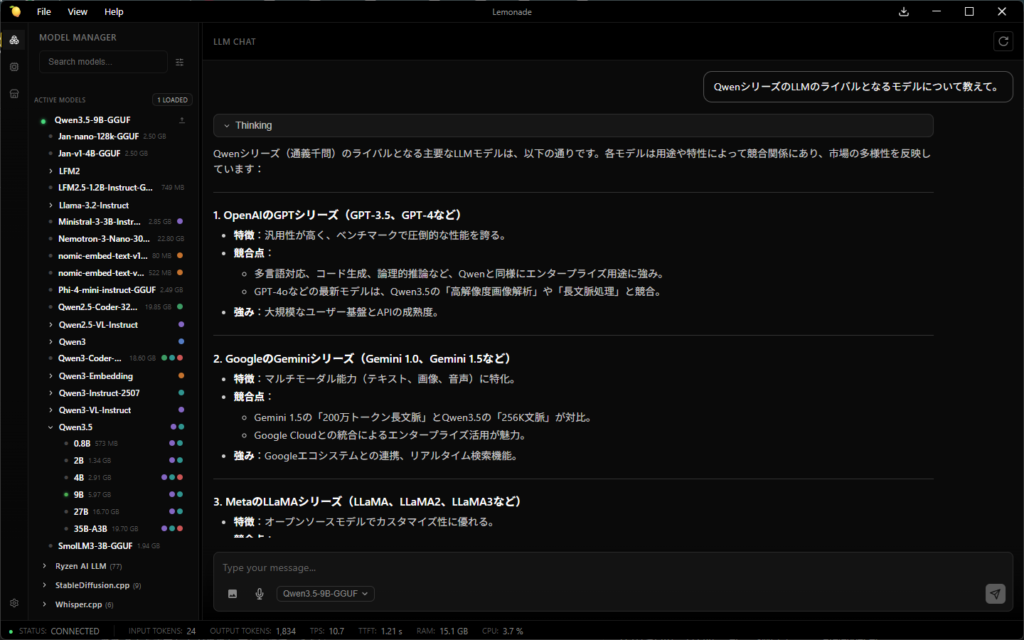 このように、Lemonadeを活用すれば複雑なコマンド操作などは一切不要です。専門外の方でも、いつものアプリを扱うような手軽さで自身のPC上にローカルAI環境を構築し、業務効率化に向けた様々な検証にすぐへ取り組むことができます。