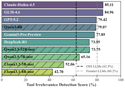 - 最先端(Frontier)APIモデルの限界: 優れた内部能力を持つ最先端のAPIモデルは、OSSモデルよりもツール呼び出しの頻度自体は低く抑えられています。しかし、質問に対して提供されたツールがすべて無関係な場合であっても、最先端モデルは約19.8%の割合で誤って無関係なツールを呼び出してしまうエラーを起こします。なお、OSSモデルではこのエラー率が約37.5%にまで跳ね上がるため、より注意が必要です。