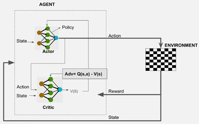 - その評価結果は、アドバンテージ関数(Advantage Function)という形でActorにフィードバックされます。このフィードバックを受け、Actorはより良い方策へと更新されます。