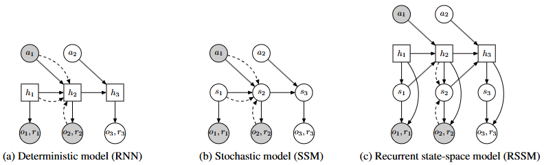 潜在空間での学習をさらに推し進め、現在の標準的な手法となっているのが「Dreamer」シリーズです。その中核を成すのが「RSSM(Recurrent State-Space Model)」と呼ばれる技術です。 RSSMの革新性は、環境のモデル化において「過去の記憶」と「未来の不確実性」を巧みに統合した点にあります。具体的には、RNN(再帰型ニューラルネットワーク)を用いて過去の履歴情報を集約する「決定論的パス」と、そこから分岐する未来の可能性を表現する「確率的パス(状態空間モデル)」を組み合わせています。これにより、エージェントは過去の文脈を維持しながら、不確実な未来の展開を安定してシミュレーション(想像)することが可能になりました。最新のDreamerV3では、潜在変数を離散化することで、さらにロバストな学習を実現しています。