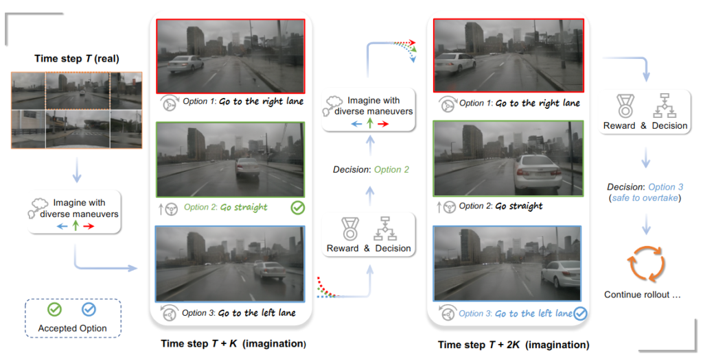 - 生成AIによるシナリオ拡張: 例えば、英国Wayve社の「GAIA-1」は、ビデオ、テキスト、アクション入力を組み合わせて将来の運転シーンを生成します。学習データには含まれない「歩道への強引な進入」のような危険な状況さえも物理的に矛盾なく生成し、AIドライバーのトレーニングデータとして活用することを可能にしました。また、「Drive-WM」はマルチビュー映像の一貫性を保ちながら未来を予測し、安全な経路計画を支援します。