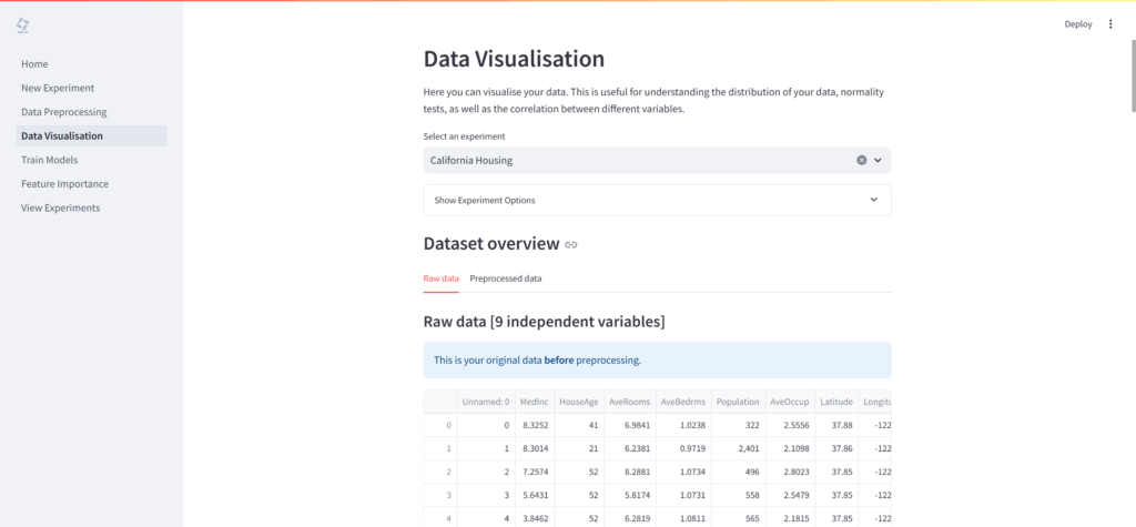 「Data Visualisation」ページでは、データセットを視覚的に探索・分析するための多様なツールが提供されています。