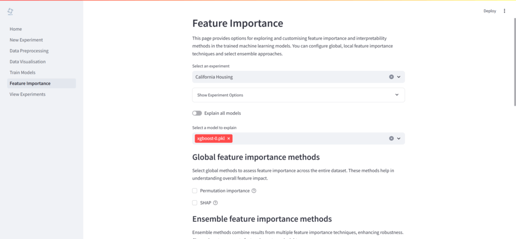 「Feature Importance」ページでは、訓練済みモデルがどのように意思決定を行っているかを解釈するためのツールが提供されます。