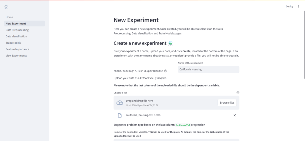- 実験の名前を入力し、分析に使用するCSVまたはXLSX形式のデータファイルを選択