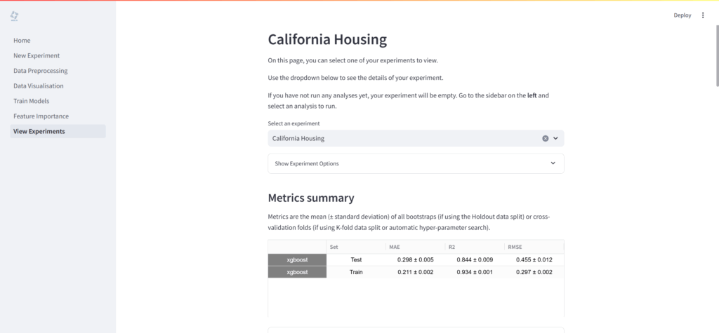 - 「View Experiments」ページでは、すべての分析結果(訓練されたモデルの性能指標、生成されたプロット、特徴量重要度の結果など)をまとめて確認可能