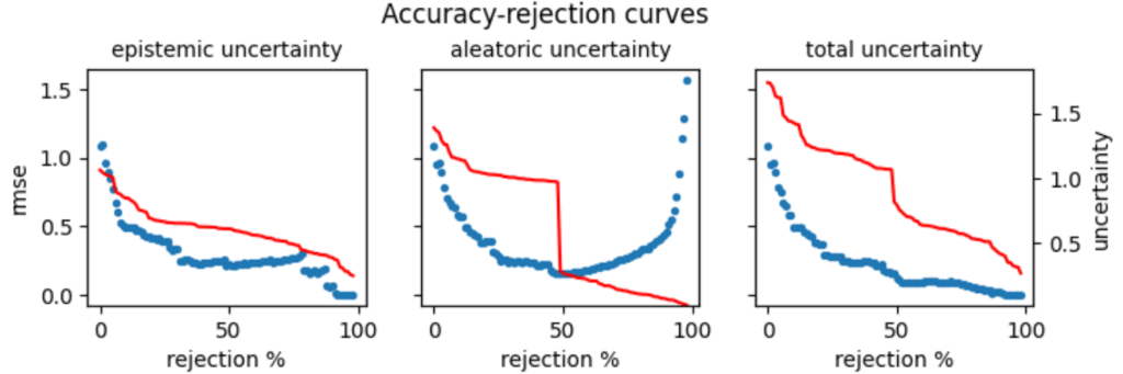 精度-拒否曲線(Accuracy-rejection curves)を使用することで、組織が目標とする予測精度(例:97%)を達成するために必要な不確実性の閾値を設定できます。この閾値より不確実性の低い予測のみを保持し、その他の予測を拒否することで、自動化された処理システムの信頼性を保証できます。